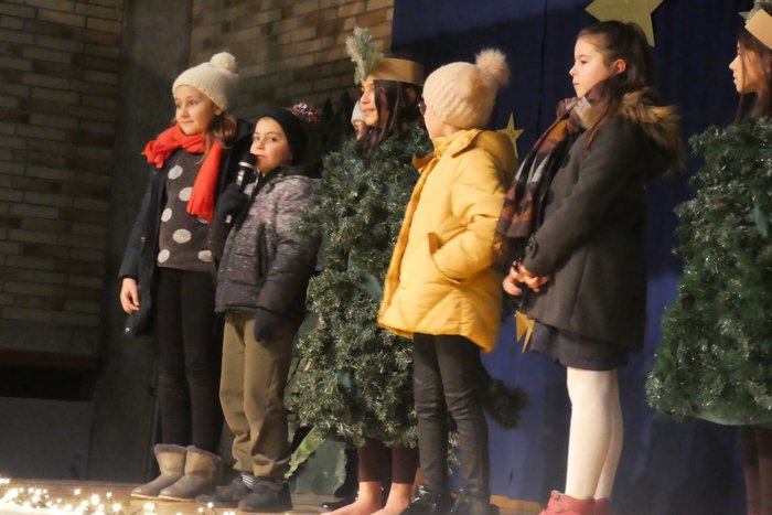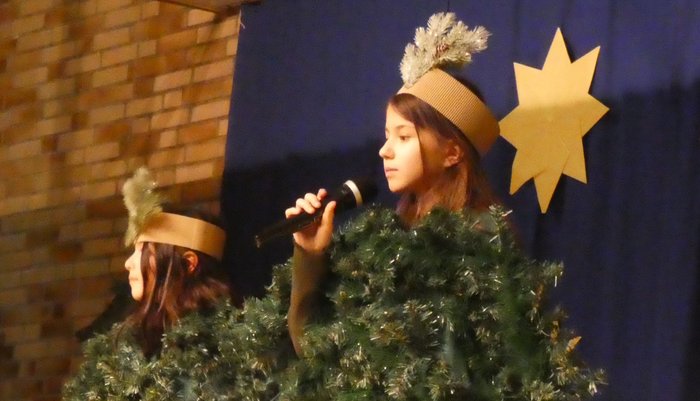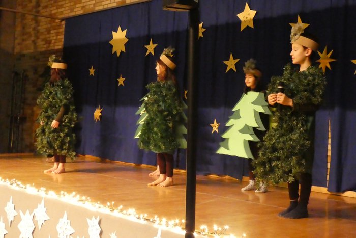 Auftritt der INKI- Kinder als wandelnde Bäume beim Weihnachtsspiel..